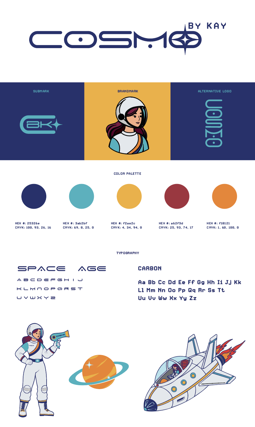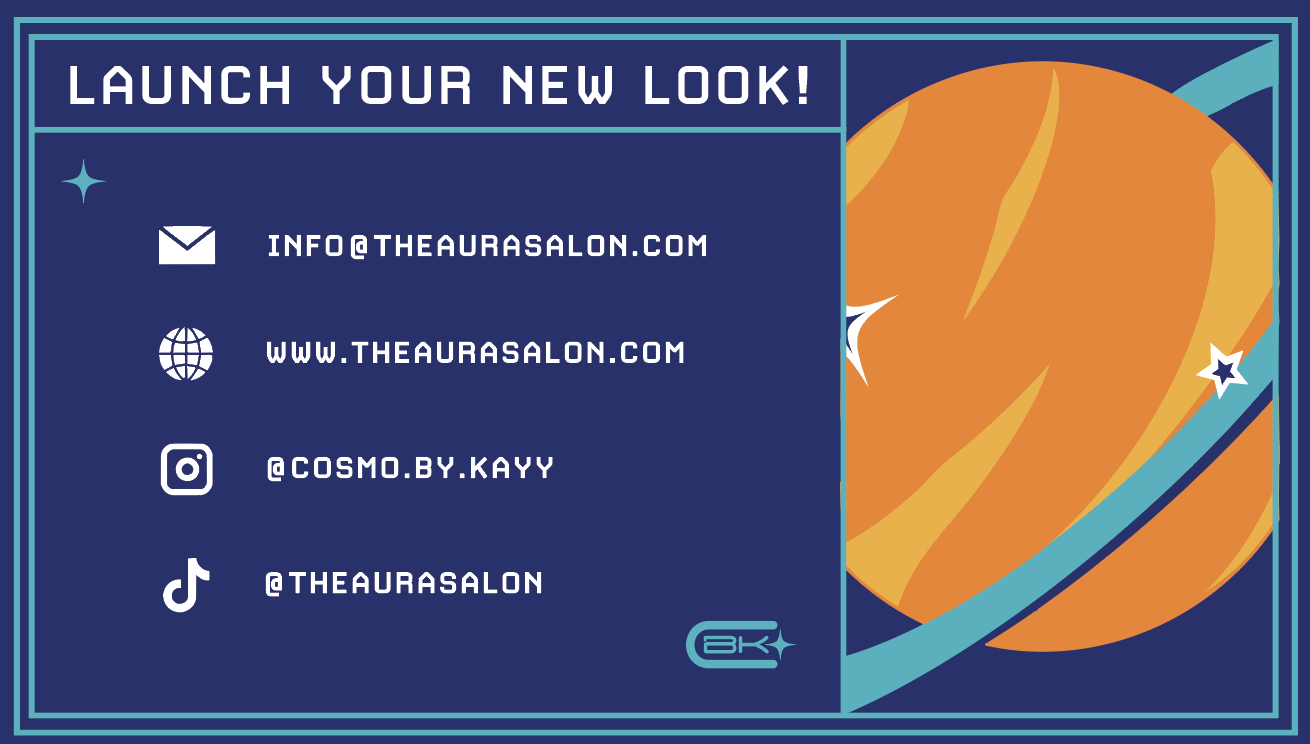 This design balances a futuristic feel with a retro influence inspired by my 60s space moodboard. “Cosmo” takes center stage to highlight the service itself, while Kay’s name is intentionally secondary. Kay is the stylist, and Cosmo represents the craft.